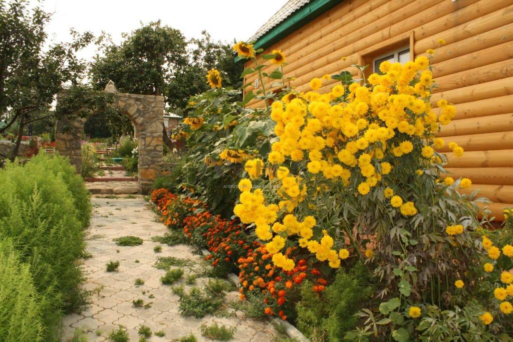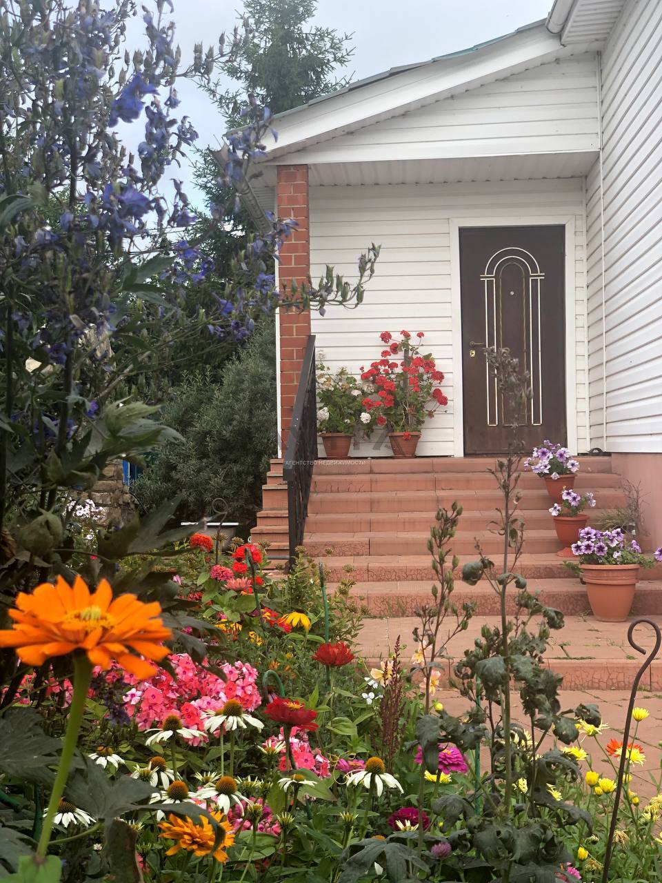 Вход в дом с крыльца с навесом, перед крыльцом выложена брусчатка, разбит цветник