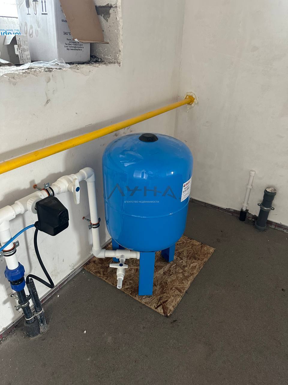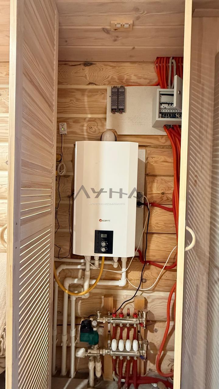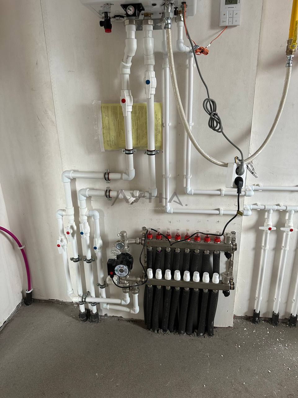 Выполнена стяжка пола, теплые полы во всем доме, есть выводы под радиаторы, заведены все коммуникации.