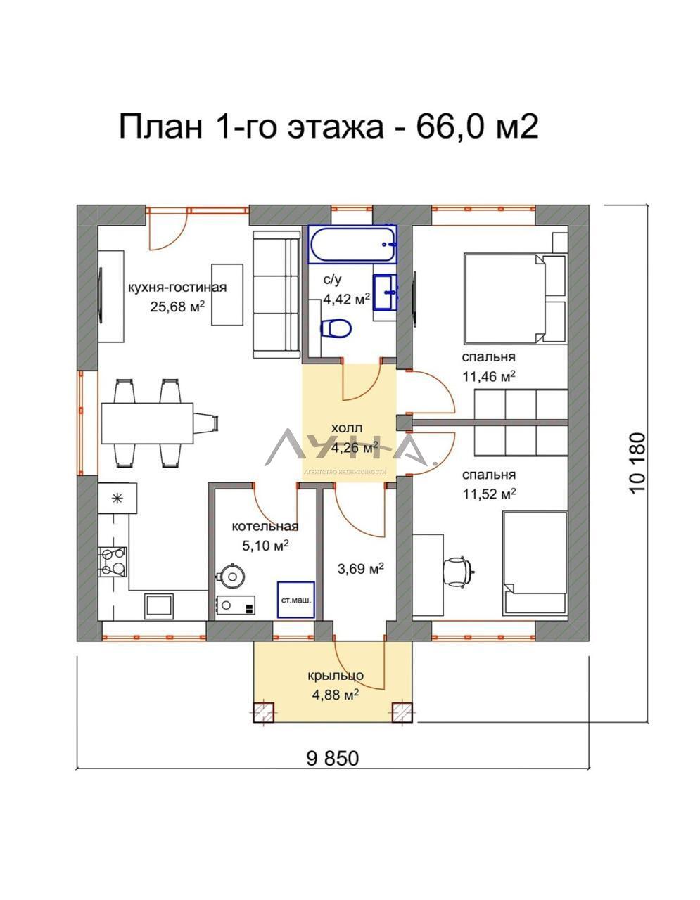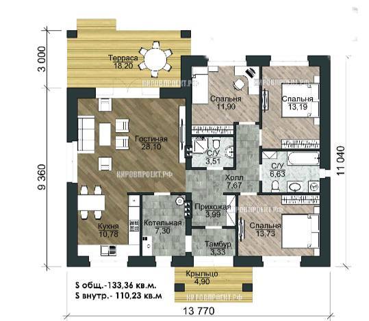 Две изолированные спальни — у родителей и детей будет личная территория. А большая кухня-гостиная (20 м²) станет сердцем вашего дома.